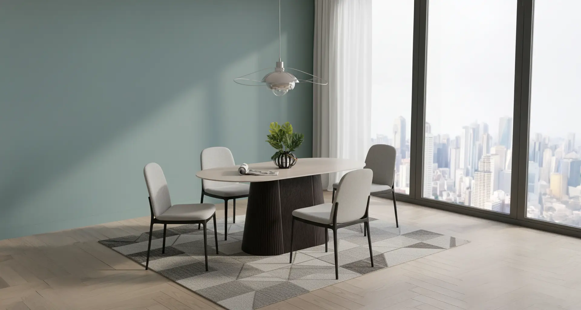 Η τραπεζαρία “Ellipse” επαναπροσδιορίζει την κομψότητα, συνδυάζοντας την οργανική ρευστότητα με την τολμηρή αρχιτεκτονική. Το αστέρι αυτού του σχεδίου είναι η ενιαία, κεντρική βάση της, η οποία διαθέτει μια εκλεπτυσμένη, κάθετη ραβδωτή (fluted) υφή. Αυτή η βάση, φινιρισμένη σε πλούσια, σκούρα απόχρωση ξύλου, δεν παρέχει απλώς στιβαρή στήριξη, αλλά λειτουργεί ως ένα αληθινό γλυπτό στο κέντρο του δωματίου.
