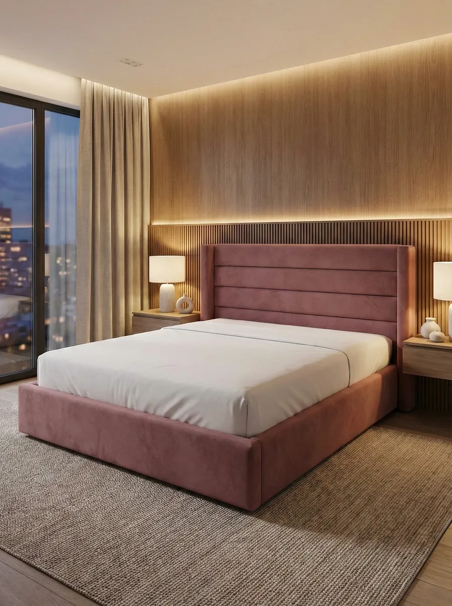Seams: The headboard is decorated with horizontal, linear seams (channel tufting) that divide the surface into wide panels, giving geometric harmony and modern style.